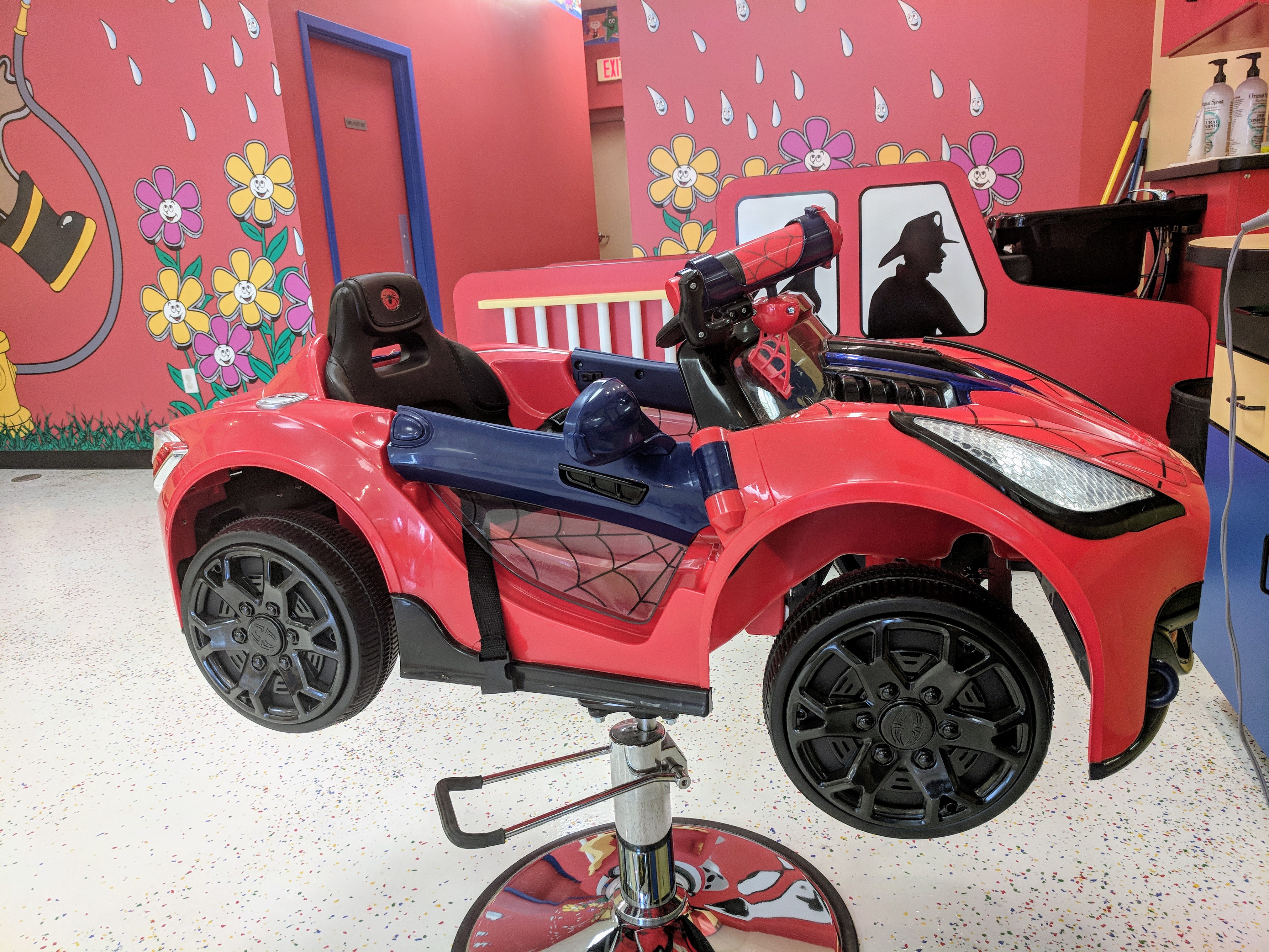 Look at how fun the salon seats are! Spiderman, princess car, navy plane, a car, and they do have regular salon chairs for the older children or parents. Look, you get your hair washed on a fire truck!