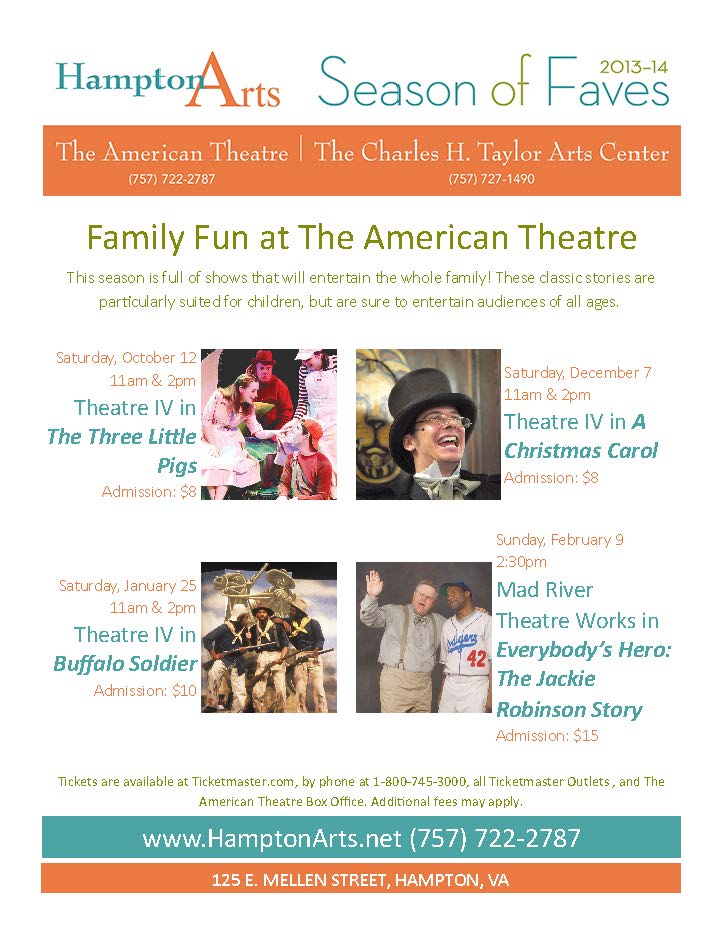 Theatre IV in The Three Little Pigs Saturday, October 12, 11am & 2pm In this funny and not-so-traditional musical version of The Three Little Pigs, the Wolf just wants to be friends with Rose, Frank, and Ham, better known as the Three Little Pigs. Wolf isn’t bad, but he is big, and boy is he clumsy! Every time he and the pigs get together, someone gets hurt and the houses get wrecked. Wolf doesn’t mean to scare them, but he doesn’t know his own strength so he turns to Mama Pig for help. She teaches him how to be gentle and careful through lessons of thoughtfulness and acceptance of differences. In this new take on a classic story, houses of stray, sticks, and bricks are rebuilt, along with friendships. Admission: $8 *Additional fees may apply.