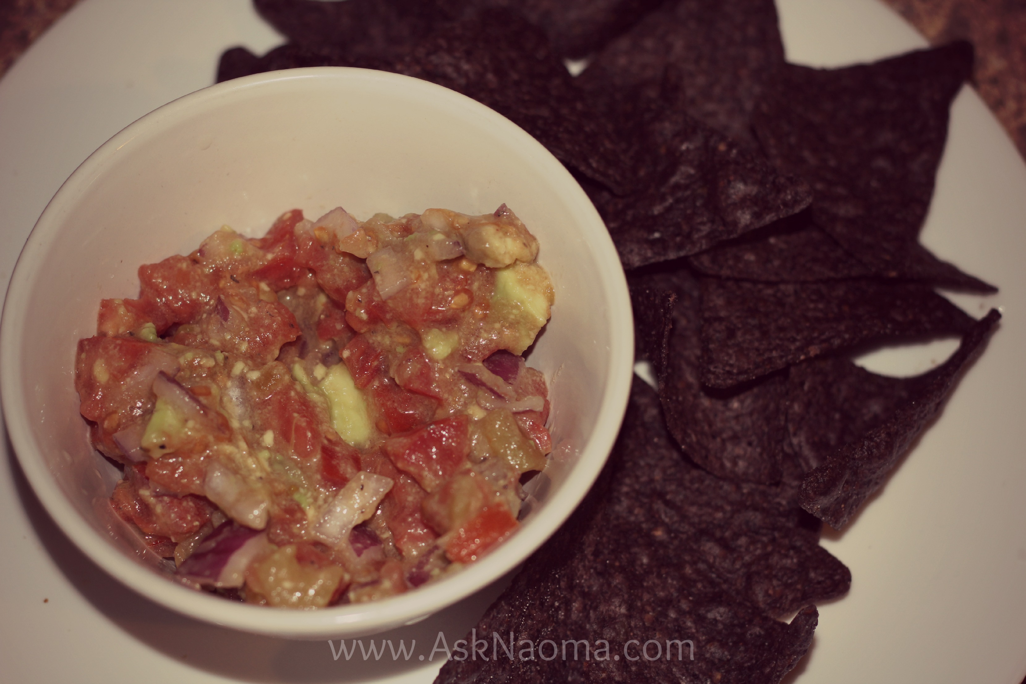 6 ripe Roma tomatoes 1 small onion 1 small avocado 1 can (4 ounces) diced mild green chiles 1 lemon or lime Blue corn tortilla chips Just chop of everything and stir together.