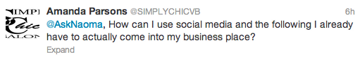 @simplychicvb asks on twitter how can they use social media to have clients come into place of business?